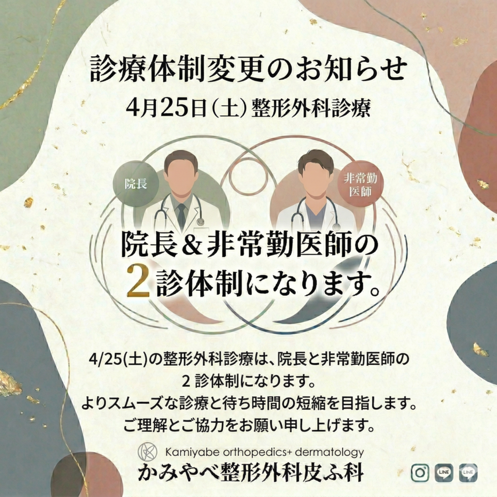 4月25日(土)の整形外科は、院長と非常勤医師の**【2診体制】**となります。